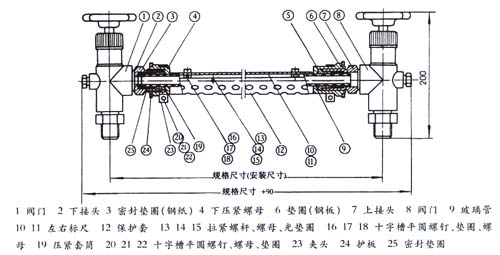 首先將卡箍,防護罩拆卸下來,再松開上,下閥門的連接螺母,取出填料壓蓋和密封墊圈,去掉破碎的玻璃管,然后應順次將連接螺母,填料壓蓋,密封墊圈套于玻璃管的兩頭,先將玻璃管的下端插入下閥門,再將上端插入上閥門,旋扭連接螺母,基本緊固玻璃管,待裝上防護罩后再旋緊,用卡箍鎖緊。